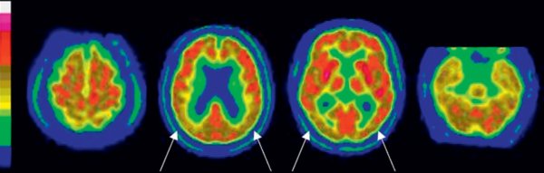 Exemple de l'aspect en TEP cérébrale au 18F-FDG en coupe axiale d'une maladie d'Alzheimer (de l'apex à gauche vers la base du crâne à droite).À gauche, l'échelle de couleur (le cortex présente normalement une fixation homogène qui apparaît en rouge), suivie des coupes axiales en TEP montrant un hypométabolisme modéré diffus qui prédomine au niveau des régions associatives postérieures (flèches).