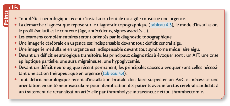 - Tout déficit neurologique brutal ou aigu doit faire suspecter un AVC et nécessite une imagerie cérébrale en urgence (fig. 4.1);