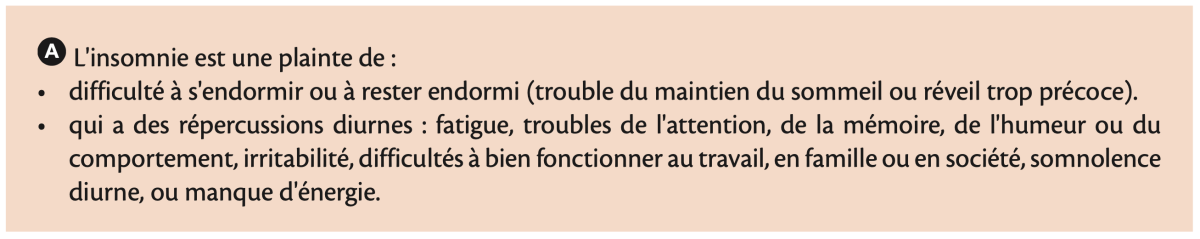 Le diagnostic d'insomnie correspond à une plainte subjective, pas à un chiffre objectif de durée ou de latence de sommeil. Cependant, on considère qu'il est anormal de mettre plus de 30 minutes à s'endormir. Une insomnie chronique associée à un temps objectif de sommeil < 6 heures expose à un risque accru de morbi-mortalité cardiovasculaire et de diabète, mais la majorité des insomniaques dorment réellement plus de 6 heures