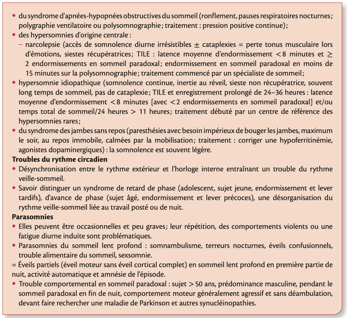 - Traitement : mélatonine et clonazépam (Rivotril®, hors AMM). Suivi du risque neurodégénératif.