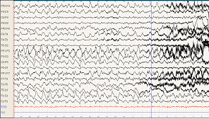 Aux urgences, l’examen clinique est normal. Le bilan biologique standard ne retrouve aucune anomalie. Les examens d’imagerie abdominale sont normaux. Il a été conclu à des épisodes viraux gastro-intestinaux et une consultation de gastro-entérologie est programmée. Cette hypothèse ne vous séduit pas et notamment du fait du dernier malaise. Un diagnostic vous vient alors en tête et pour le confirmer, vous faites réaliser l’EEG présenté ci-dessous. Quel est alors votre diagnostic ?